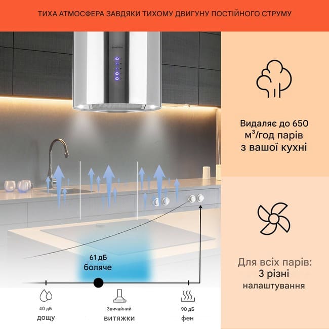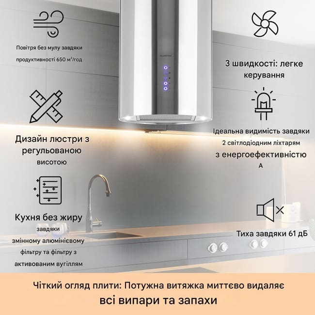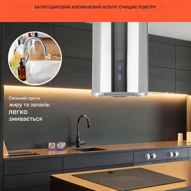 - Чисте повітря: алюмінієвий жировий фільтр, що миється, і фільтр з активованого вугілля проти кухонних запахів