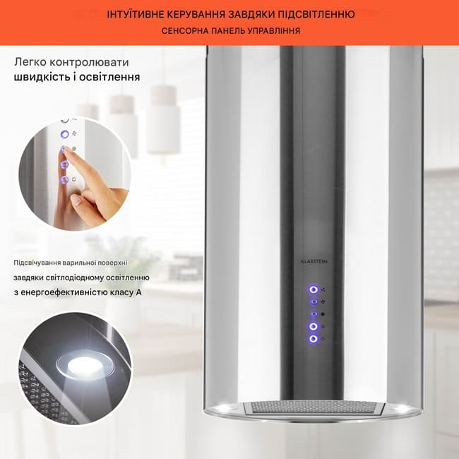 Зовнішній вигляд острівної витяжки Klarstein Beretta також абсолютно елегантний . Круглий корпус із шліфованої нержавіючої сталі легко надає вашому кухонному острову стильного блиску.