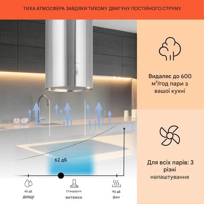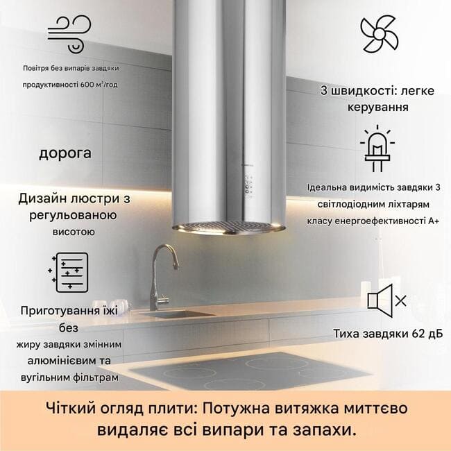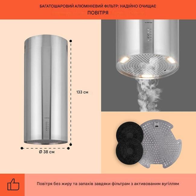 - Розміри витяжки: приблизно 38 x 42 см (ØxH).