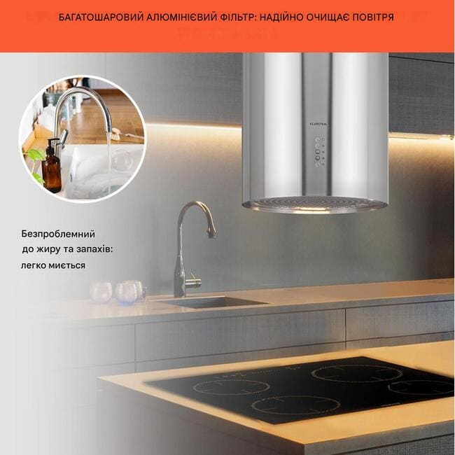 Елегантність для чистого повітря: острівна витяжка Klarstein Bolea приносить блиск кухні та звільняє повітря від пари та запахів.