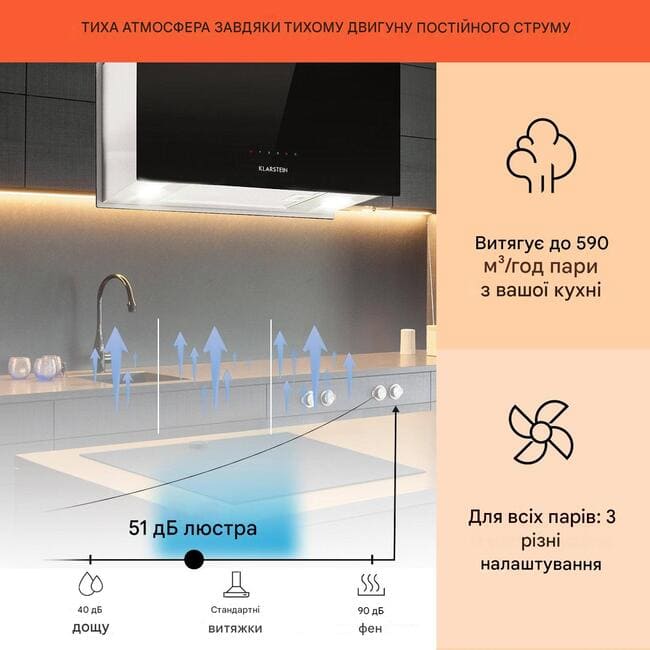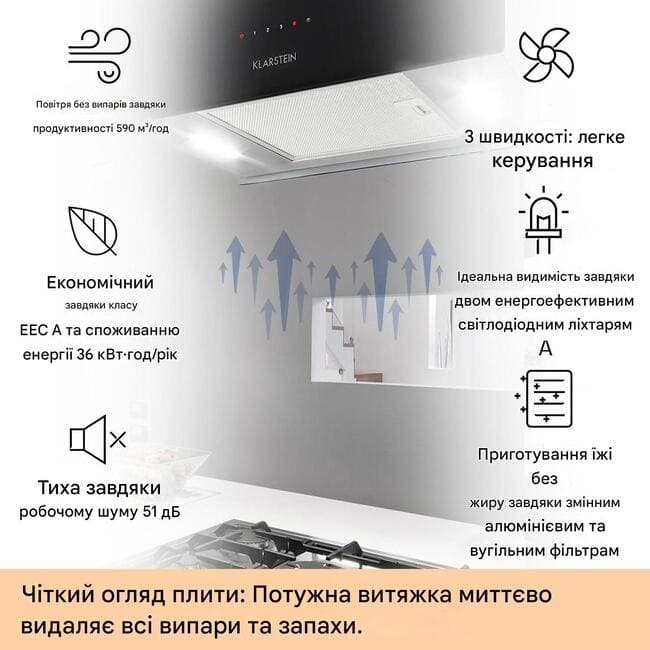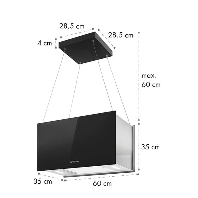 Зовнішній вигляд острівної витяжки Klarstein люстри L також елегантний завдяки чистому атмосферному дизайну . Передня і задня сторони сяють розкішним чорним безпечним склом, а бічні сторони виготовлені з матової нержавіючої сталі.