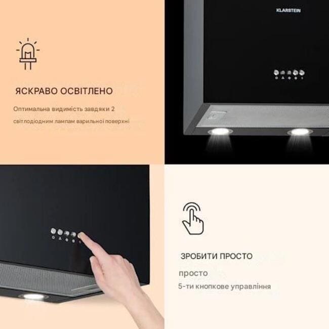 Витяжка Monumenta від Klarstein вражає своїм простим керуванням, високою продуктивністю та елегантним незграбним дизайном. Завдяки швидкості повітряного потоку до 559 м³/год настінна витяжка забезпечує чисте повітря на кожній кухні та не залишає шансів для диму та різких запахів. Два вбудовані світлодіоди освітлюють ваше приготування їжі яскраво, як удень. Усіма функціями зручно керувати за допомогою 5-кнопкової панелі керування на передній панелі. Високоякісні матеріали та сучасний дизайн у поєднанні створюють справжню привабливість. Завдяки трьом рівням потужності, низьким робочим шумом 68 дБ і класу енергоефективності B Klarstein Monumenta збагатить атмосферу вашої кухні.