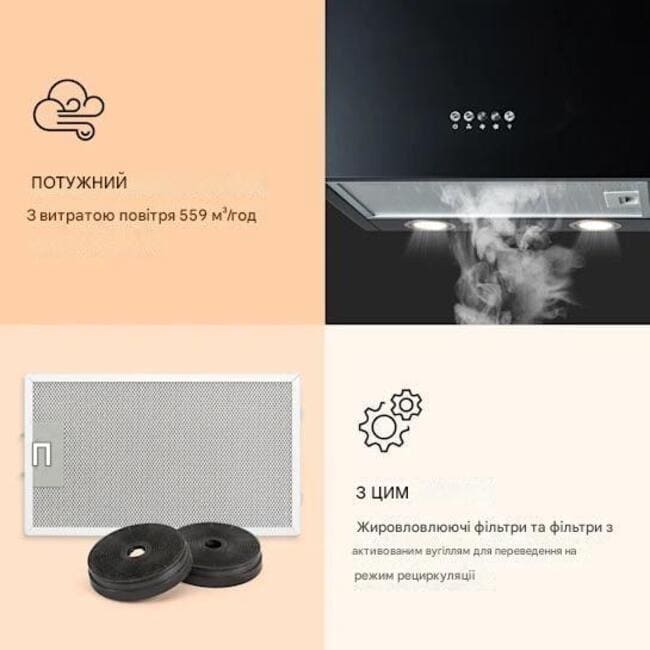 - Можливий режим рециркуляції з фільтром з активованого вугілля