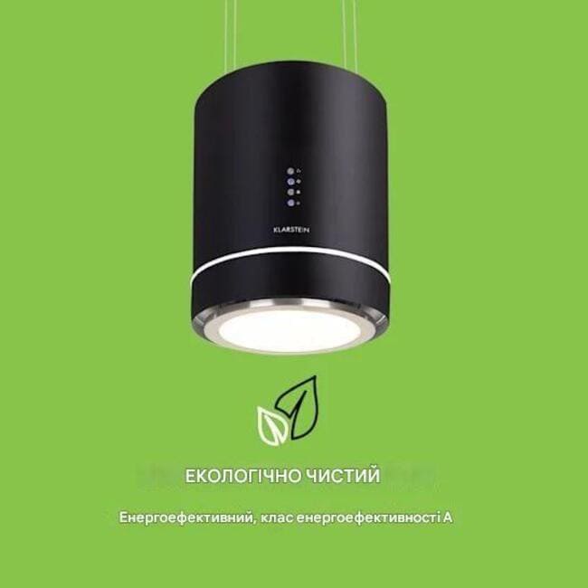 Зовнішній вигляд острівної витяжки Klarstein Tron Ambience також абсолютно елегантний . У дизайні PureAmbience круглий чорний корпус із яскраво освітленим світлодіодним кільцем надає кухонному острову футуристичного блиску.