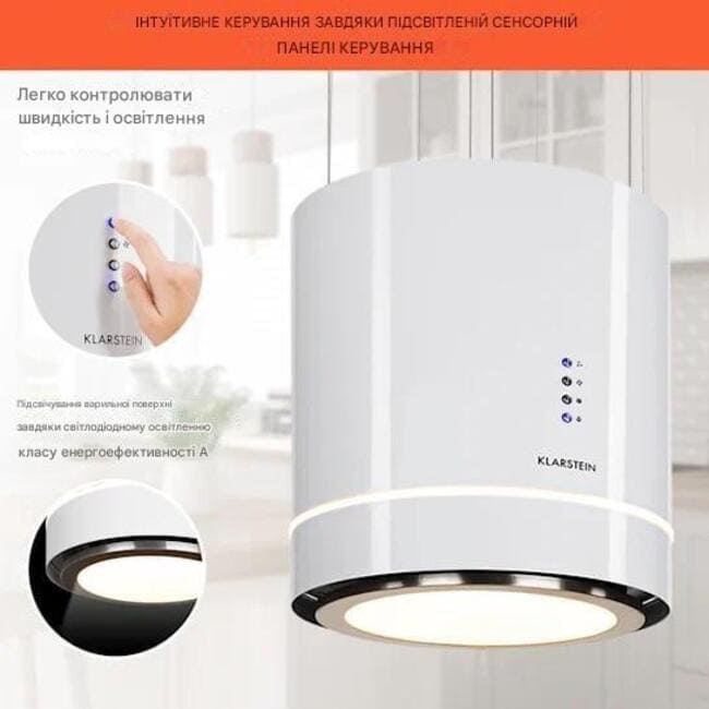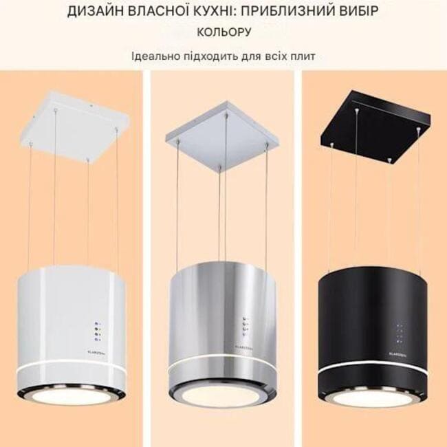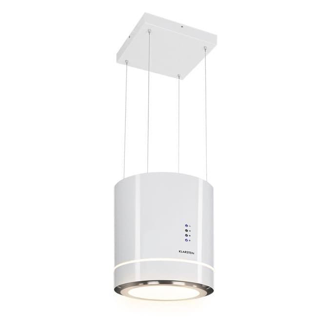 Зовнішній вигляд острівної витяжки Klarstein Tron Ambience також абсолютно елегантний . У дизайні PureAmbience круглий чорний корпус із яскраво освітленим світлодіодним кільцем надає кухонному острову футуристичного блиску.