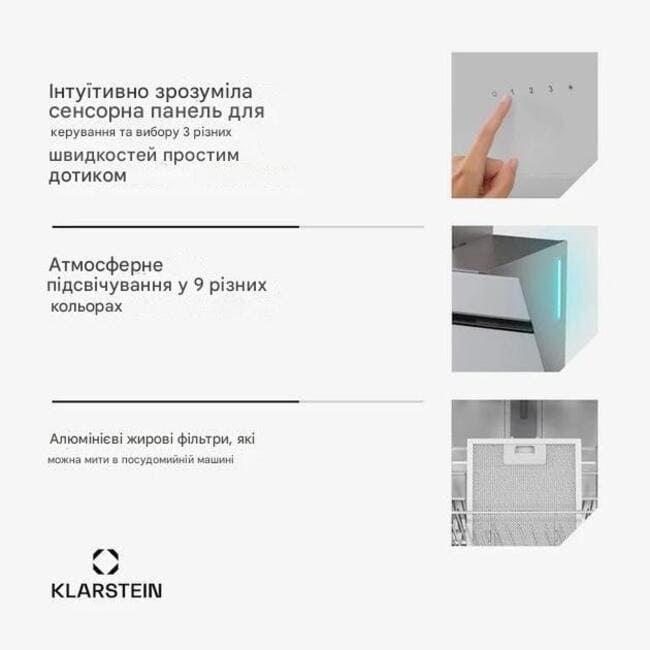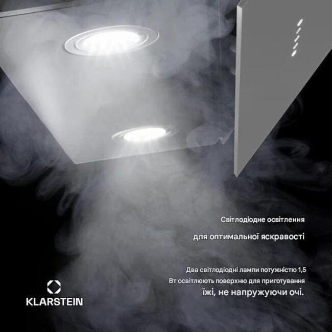 Витяжка Klarstein Alina особливо приваблива не тільки завдяки своєму елегантному зовнішньому вигляду, а й завдяки опціональному перемиканню зовнішнього освітлення з дев'ятьма різними кольорами. Таким чином, настінна витяжка без головки надає кожному кухонному гарнітуру.