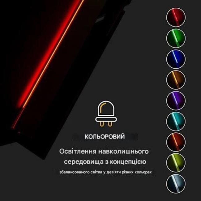 - Доступні кольори світлодіодів: білий, червоний, зелений, синій, жовтий, фіолетовий, помаранчевий, бірюзовий і жовто-зелений