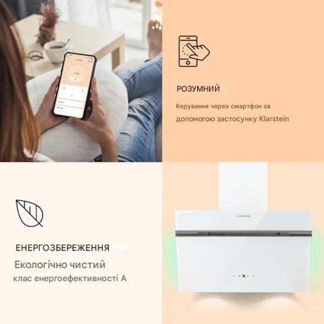 Розумна, атмосферна та елегантна: це витяжка Klarstein Alina 60 Smart . Він не тільки вражає своїм продуманим і гармонійним дизайном як витяжка , ви можете легко керувати Alina за допомогою смартфона завдяки вбудованому інтерфейсу WiFi. Завдяки трьом рівням швидкості, продуктивності витяжного повітря 594 м³/год і прихованому жировому фільтру він надійно видаляє пару та бульбашки з вашої кухні. Перемикається навколишнє освітлення з дев'ятьма різними кольорами забезпечує особливу родзинку. Світлодіодне підсвічування варильної панелі знизу чудово освітлює процес приготування та радує тих, хто стежить за посудом. Додаткова передня сенсорна панель управління ідеально вписується в елегантну скляну поверхню та підкреслює сучасний вигляд настінної витяжки Klarstein Alina 60 Smart .