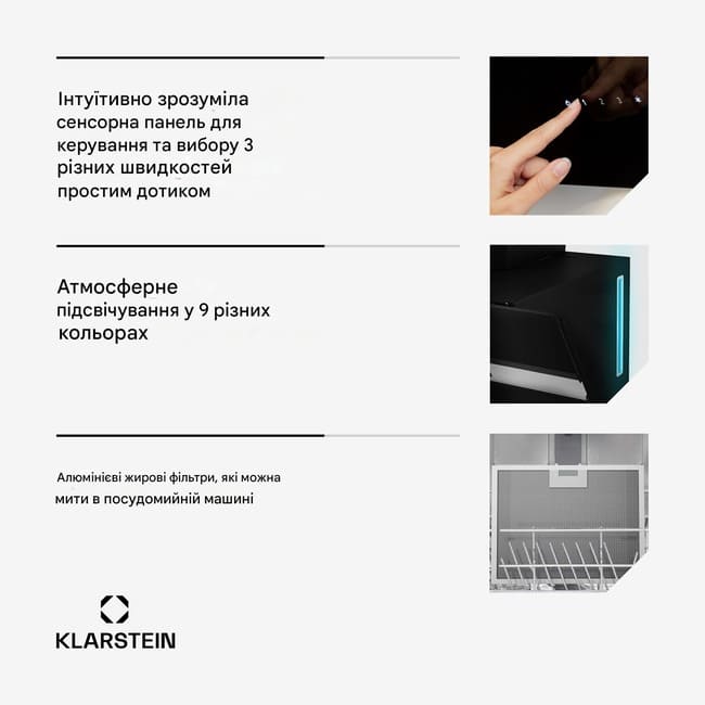 Тепер на кухні панує блиск і атмосфера, а витяжка Klarstein Alina також усуває пару та запахи їжі.