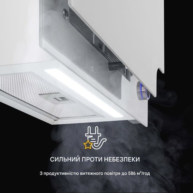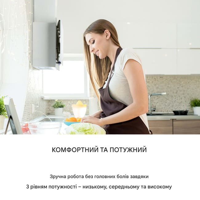 - Мінімальна висота витяжки над поверхнею для приготування їжі: 40 см для електричних плит та 45 см для газових плит