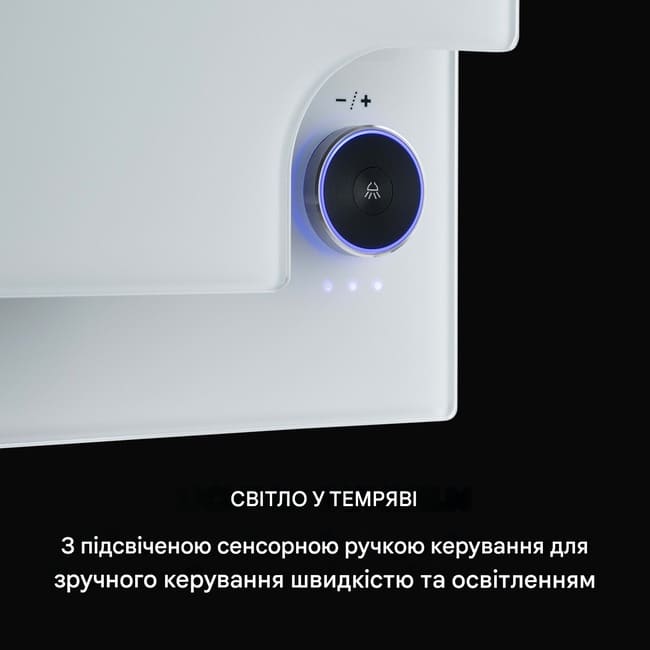 Залежно від кількості пари, що генерується, ви маєте три налаштування швидкості вентилятора – низьку, середню та високу. Amelia легко керується за допомогою підсвіченого сенсорного регулятора на передній панелі. Тут також можна ввімкнути яскраве 3-ватне світлодіодне підсвічування, яке корисно освітлює каструлі та сковорідки зверху та забезпечує корисну інформацію для завзятих спостерігачів за приготуванням їжі.