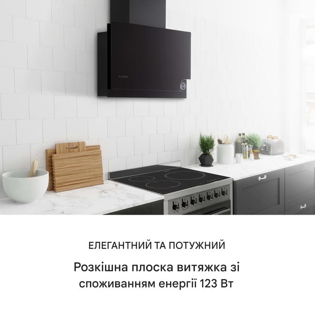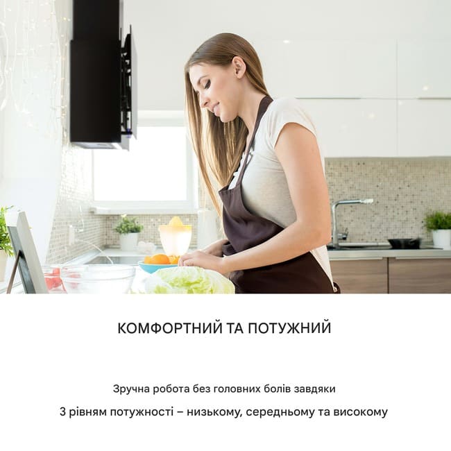 - Мінімальна висота витяжки над поверхнею для приготування їжі: 40 см для електричних плит та 45 см для газових плит