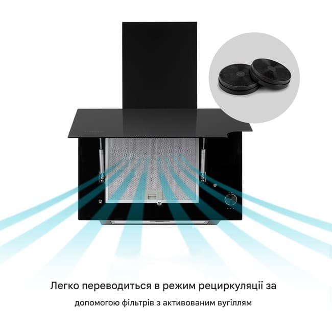 У комплекті є жирові фільтри, які можна легко мити в посудомийній машині. Перехід на режим рециркуляції також є простим завдяки двом фільтрам з активованим вугіллям.