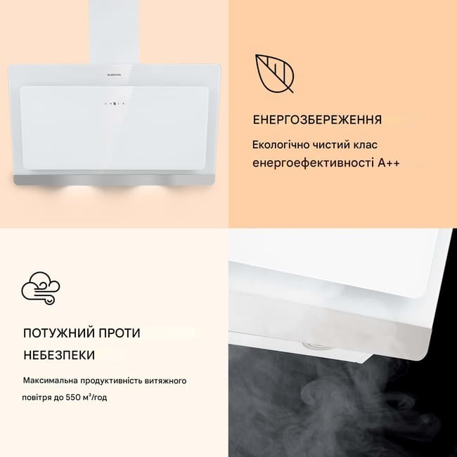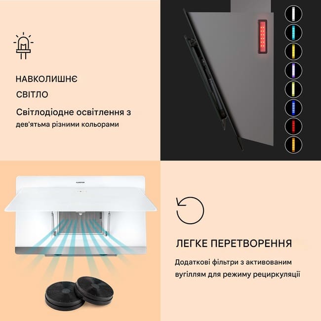 Тепер ваша кухня буде світлою та атмосферною - а витяжка Klarstein Aurora 90 Smart також видаляє пару та запахи їжі. Завдяки потужності відпрацьованого повітря до 550 м³/год у три етапи, якими можна керувати за допомогою програми або сенсорного дисплея, Aurora 90 Smart невтомно видаляє пару та запахи з кухні. Особливий шарм випромінює не лише його стильний зовнішній вигляд із загартованого скла, але й перемикання зовнішнього освітлення в 9 кольорах на вибір. Потужне світлодіодне підсвічування варильної поверхні також забезпечує чіткий огляд каструль і сковорідок.