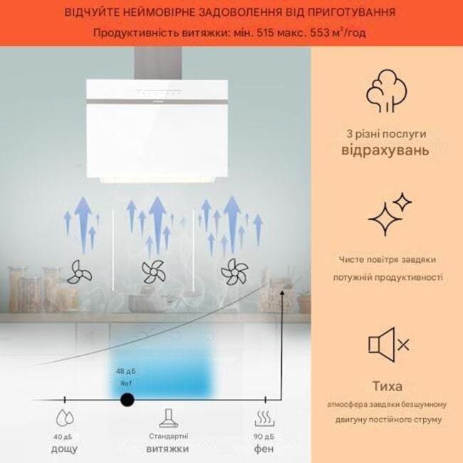 - Потужність: максимальна продуктивність витяжного повітря до 515 м³/год