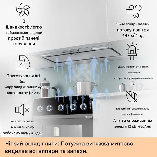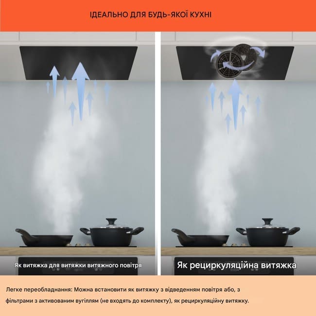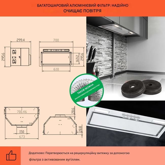 Завдяки стриманому сучасному дизайну витяжка для кухні легко вписується в будь-який інтер’єр. Модель підтримує як режим відведення повітря, так і режим рециркуляції (з використанням фільтрів з активованим вугіллям).