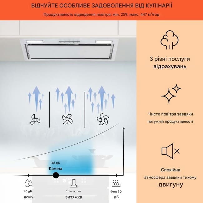 Найкраща якість повітря на кухні без зайвих деталей: витяжка кухонна Klarstein Camila повністю інтегрується під шафу та практично зливається з меблями. Завдяки потужному двигуну 70 Вт і трьом рівням швидкості пристрій ефективно усуває пару, запахи та жирові випари з максимальною продуктивністю до 397 м³/год, а в режимі Boost — до 447 м³/год.