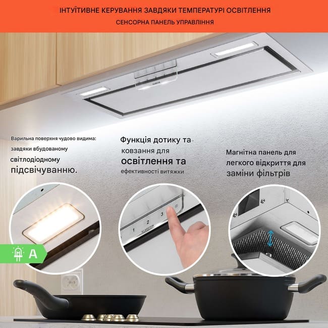 Інтуїтивна сенсорна панель із підсвічуванням дозволяє швидко керувати режимами вентиляції та освітленням. Додатково передбачено функцію підсилювача та 5-хвилинний таймер залишкового ходу для повного очищення повітря після приготування.