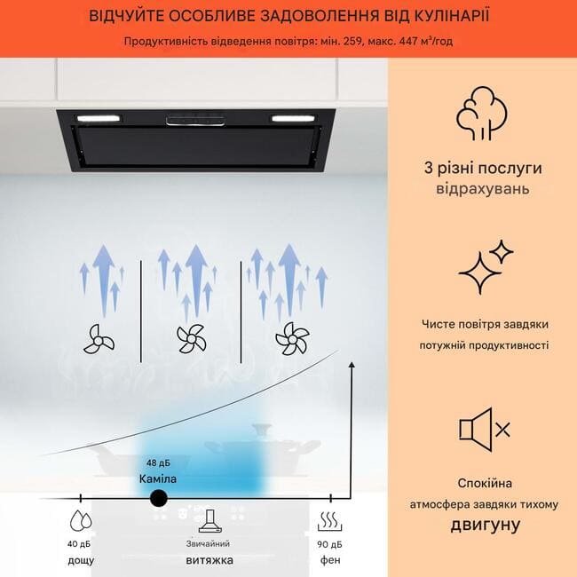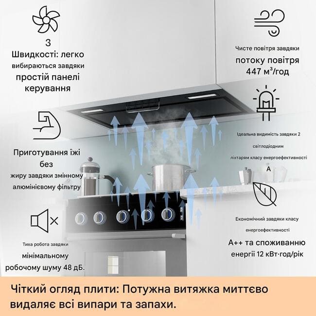 - Потужність відведення повітря 397 м³/год на максимальному рівні