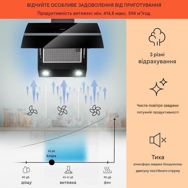 Витяжка Klarstein Clara 60 надійно поглинає запахи та випаровування з продуктивністю відпрацьованого повітря 509 м³/год і забезпечує приємний клімат у приміщенні під час будь-якої діяльності з приготування їжі . Чіткий, але елегантний дизайн Clara 60 привертає увагу над вашою плитою, а перемикання зовнішнього освітлення робить настінну витяжку сяючою. Ця витяжка без голови також пропонує вам можливість зручно та чітко виконувати всі налаштування за допомогою сенсорного керування. Добре прихований за скляною передньою частиною алюмінієвий жировий фільтр, який можна мити в посудомийній машині: він захищає канал витяжного повітря та внутрішню частину від забруднення.