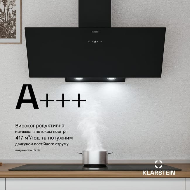 Потужний двигун постійного струму на 55 Вт разом із продуктивністю до 417 м³/год ефективно усуває запахи, пару та жирові випари. Яскраве LED-підсвічування класу A гарантує чітку видимість робочої зони. Доступні 3 рівні потужності та режим Boost для інтенсивного приготування.