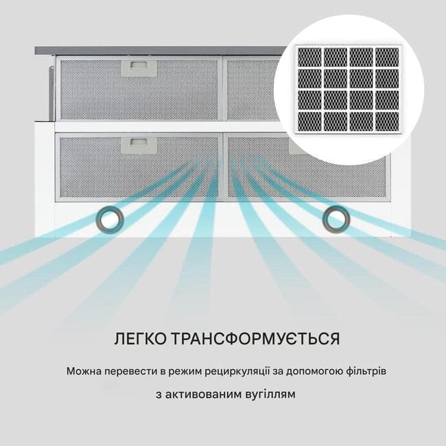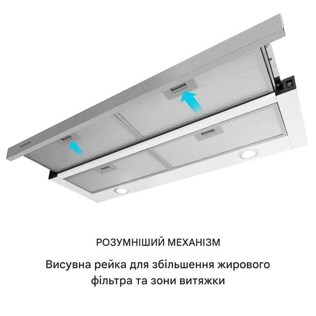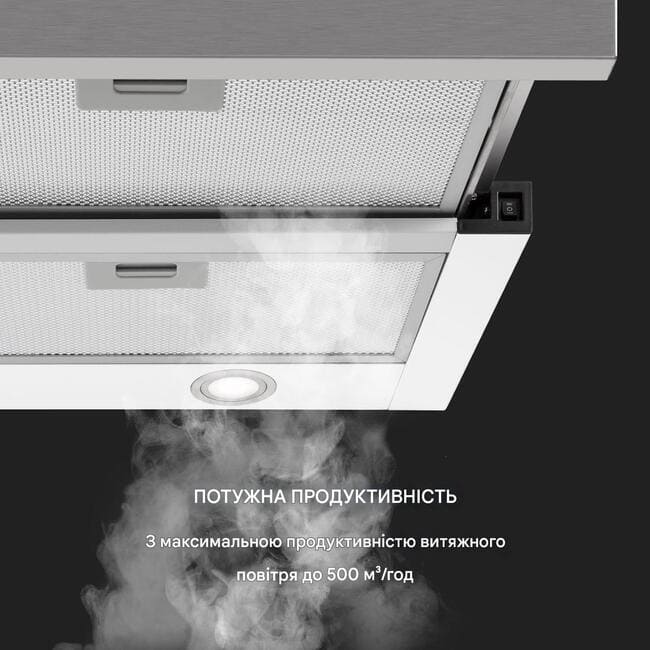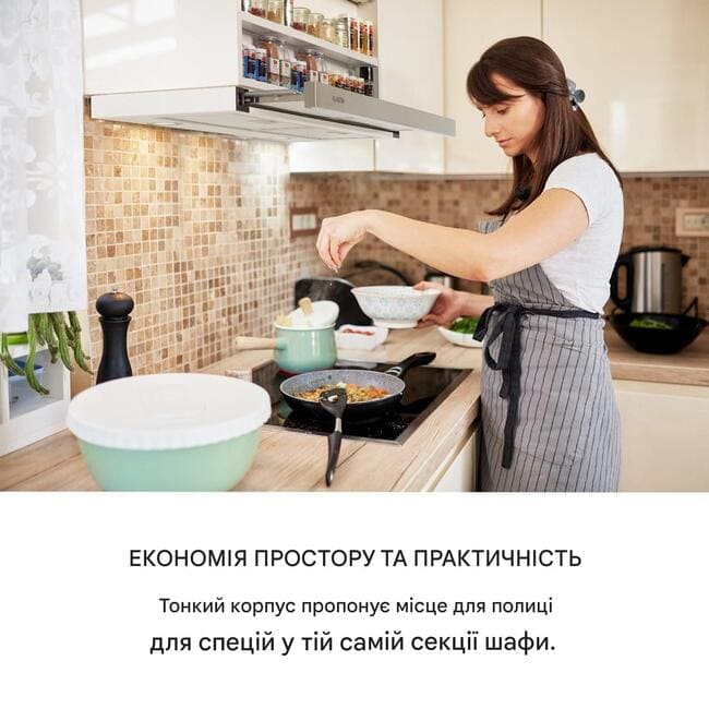 Витяжка з плоским екраном легко монтується на підстільні шафи і завдяки своїй компактній конструкції залишає достатньо місця для полиць для зберігання спецій або кухонного начиння. За допомогою лише однієї ручки нижня планка витяжки висувається, щоб подвоїти площу жиропоглинаючого фільтра та швидко та ефективно видаляти запахи їжі, дим і пари з максимальною продуктивністю витяжного повітря 500 м 3 / год.