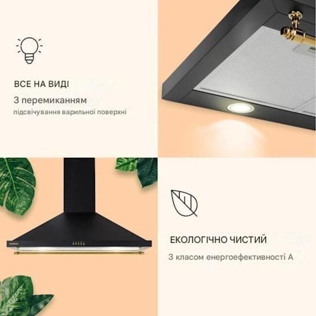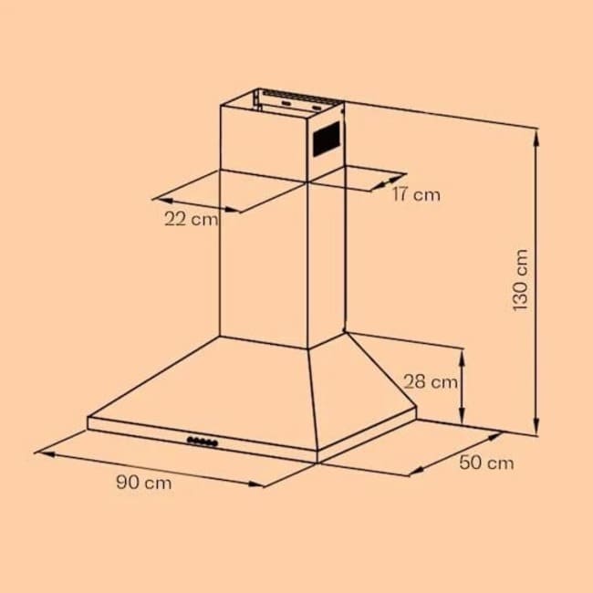 - Розміри (витяжка без димоходу): приблизно 90 x 28 x 50 см (ШxВxГ)