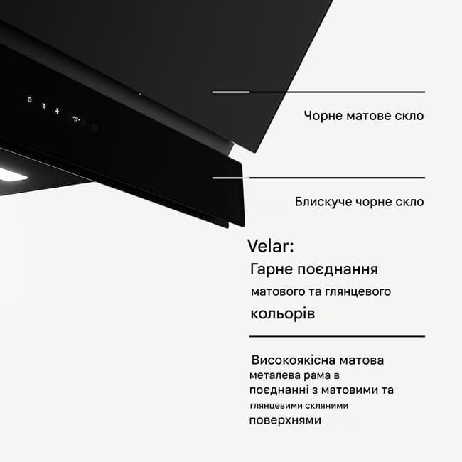 Елегантне поєднання матових і глянцевих поверхонь формує чисту геометрію та підкреслює сучасний інтер’єр. Настінна витяжка гармонійно інтегрується в кухонний простір і стає візуальним акцентом серії Velaire.