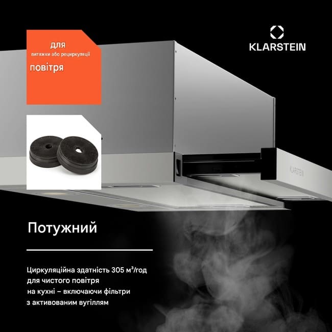 Витяжку можна легко використовувати в режимі рециркуляції. Два додаткові фільтри з активованим вугіллям (10032843) можна використовувати для фільтрації запахів.(не входить до комплекту постачання) Звичайно, витяжку Klarstein Viola також можна під'єднати до вихлопної труби назовні.