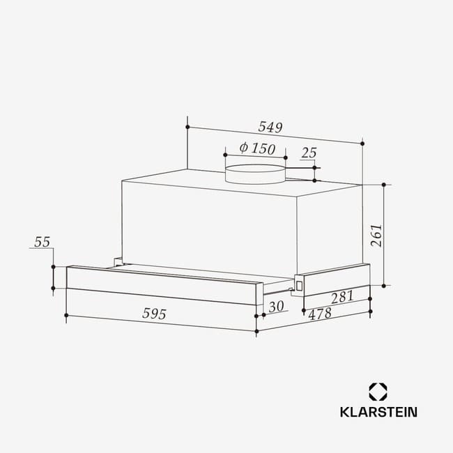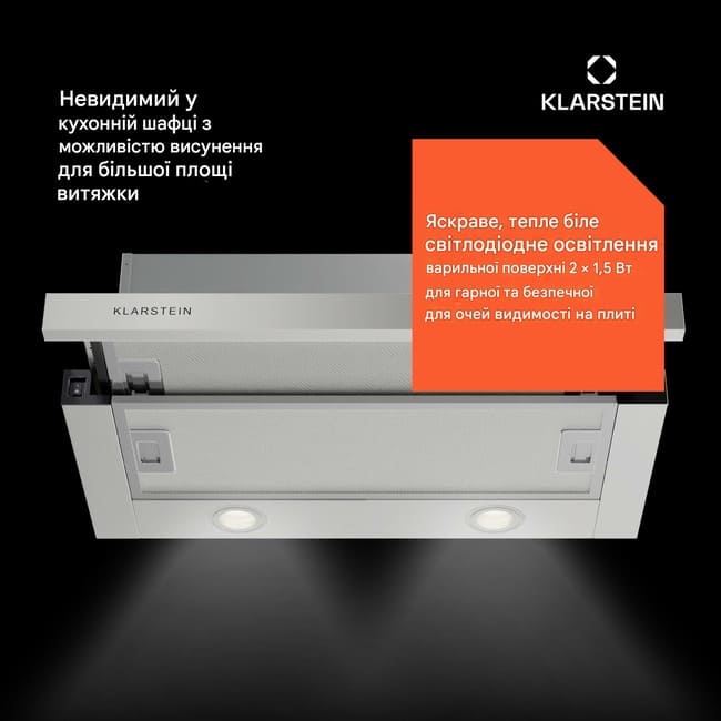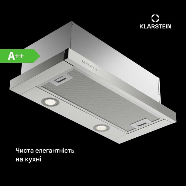 Витяжка Klarstein Viola особливо приваблива завдяки своїй телескопічній функції: просто витягніть витяжку, щоб використовувати її, і засуньте її назад у приховану основу після використання. Два варіанти монтажу дають вам можливість вирішити, де ви хочете встановити свій новий кухонний помічник: його можна просто закріпити на стіні над варильною панеллю або встановити під навісною шафою. Два тумблери полегшують керування освітленням і вентиляцією. Шикарні панелі з неіржавкої сталі довговічні та легко чистяться. Вбудований жировловлювальний фільтр легко знімається й очищається водою з додаванням невеликої кількості мийного засобу.