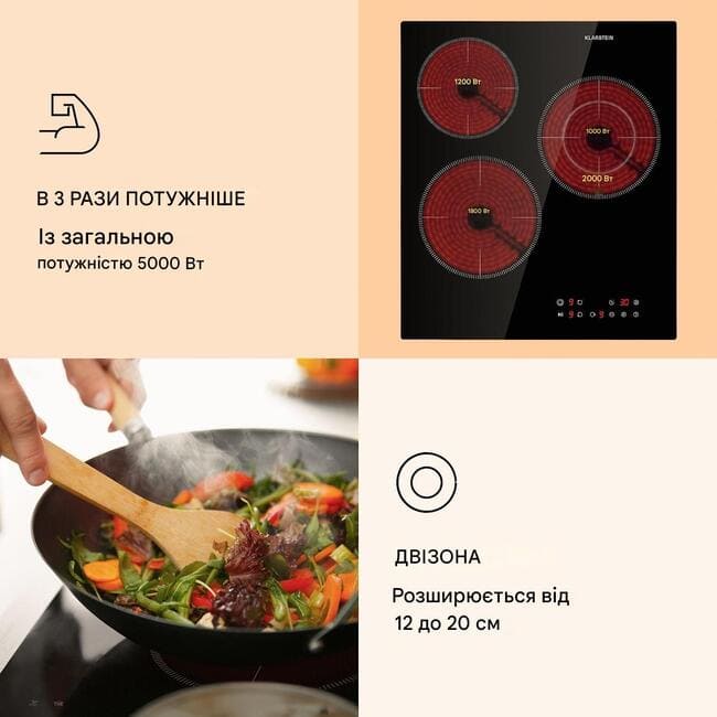 Назва плити Klarstein Virtuosa 3 Slim говорить сама за себе: тонка плита вписується в будь-який кухонний гарнітур і розподіляє свої потужні 5000 Вт на 3 поля. Подвійна зона нагрівання забезпечує ще більше гнучкості. Практичний таймер, функція stop & go і 9 рівнів потужності вміло завершують загальний пакет. Замок на ключ, захист від перегріву та переливу та індикатор залишкового тепла забезпечують необхідну безпеку.