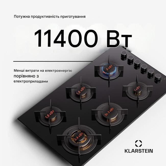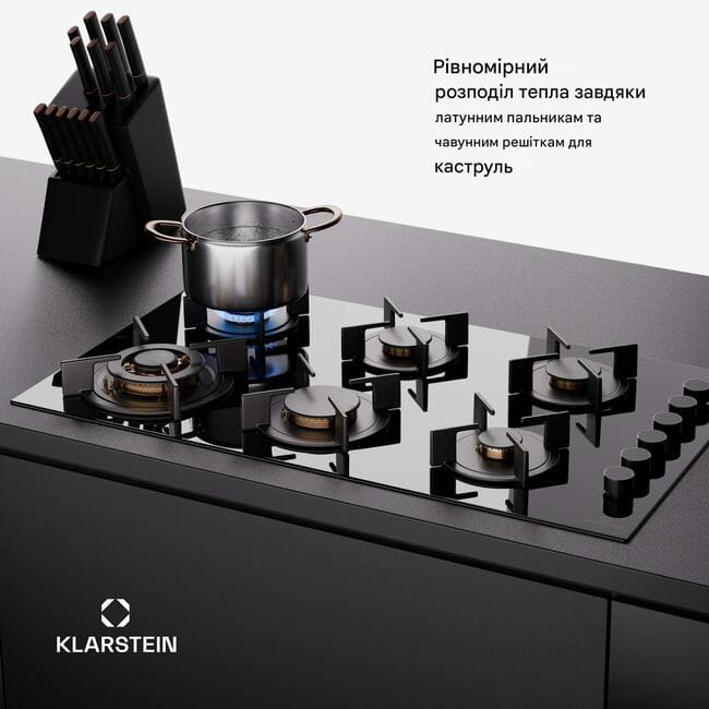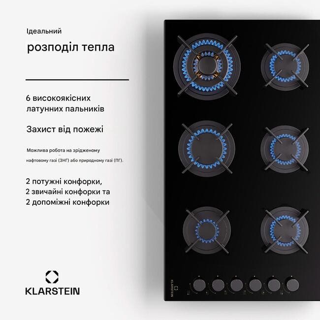 Для вибагливих кухарів Klarstein представляє газову варильну поверхню Goldflame 6 , яка поєднує переваги газового приготування їжі з ефективністю, керованістю та екологічністю. Завдяки шістьом високоякісним латунним конфоркам (3,4 кВт, 2 x 2,4 кВт, 2 x 1,8 кВт, 1,0 кВт), ця компактна варильна поверхня забезпечує оптимальне нагрівання. Довговічність конфорок та рівномірний розподіл тепла підкреслюють високу якість виготовлення. Міцні чавунні хрестовини забезпечують стабільну підтримку різного посуду.