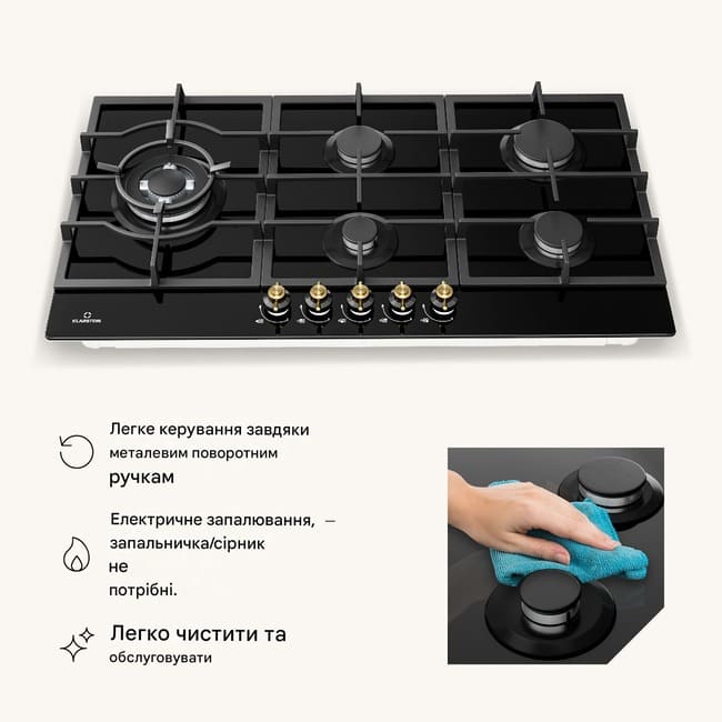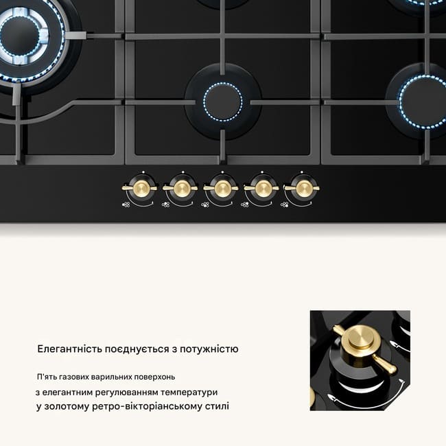 5-зонна газова плита Klarstein Victoria Chef Edition поєднує сучасний дизайн, професійну продуктивність та інтуїтивно зрозуміле керування. Модель створена для тих, хто цінує точність нагріву, безпечність експлуатації та стильний вигляд кухні.