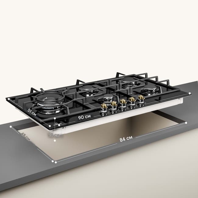 Ця газова варильна панель 90 см забезпечує достатньо простору для одночасного використання кількох каструль і сковорідок.