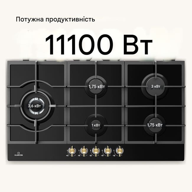 Газова варильна поверхня Klarstein Victoria Chef Edition оснащена 5 латунними пальниками із загальною потужністю 11 100 Вт. Максимальна потужність одного пальника — до 3600 Вт, що дозволяє швидко закип’ятити воду або працювати з високими температурами для обсмажування.