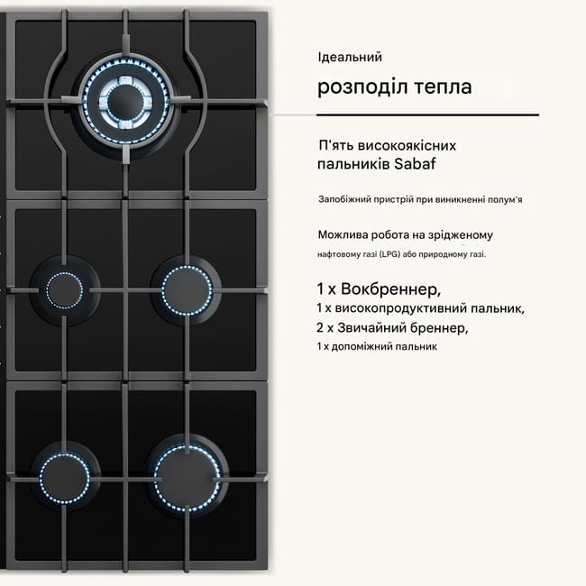 Для підвищення безпеки передбачена функція контролю полум’я — у разі його згасання подача газу автоматично припиняється.