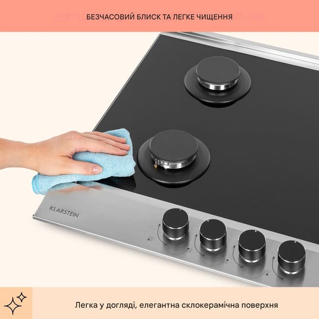 Після приготування газову плиту при необхідності можна дуже легко очистити: для цього вона має поверхню, що легко очищається, зі склокераміки і нержавіючої сталі. Він не тільки неймовірно добре виглядає, але й неймовірно простий у догляді.