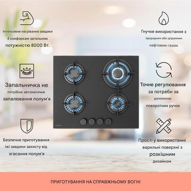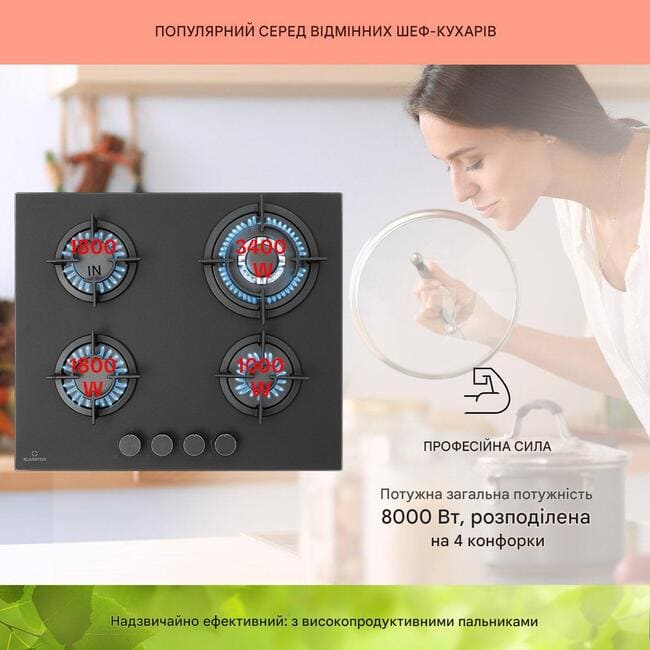 - потужна продуктивність завдяки конфорці вок потужністю 3,4 кВт, двом звичайним конфоркам потужністю 1,8 кВт і допоміжній конфорці потужністю 1 кВт
