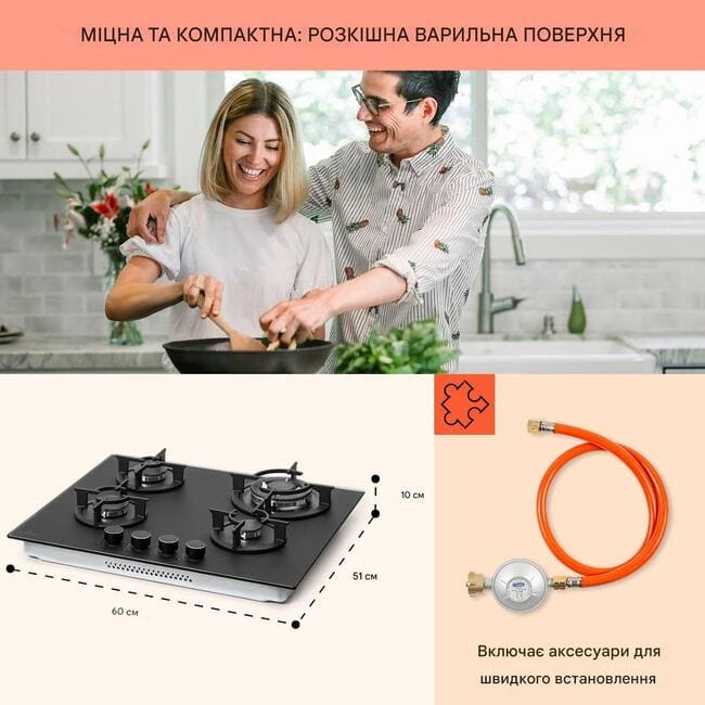 Компактна плита Klarstein Firetale має чотири алюмінієві конфорки, кожна потужністю 3,4 кВт, 1,8 кВт або 1 кВт. Вони рівномірно розподіляють тепло в середині та по краях каструль або сковорідок, тому все готується ідеально, а подачу тепла можна регулювати в будь-який час за допомогою простих регуляторів. Хрестовина з міцного чавуну підходить практично для всіх типів посуду і точно сидить над полум'ям, не перекидаючись. Ви можете легко та безпечно розпалити вогонь без будь-якого сірника чи запальнички: газове полум’я просто запалюється за допомогою SnapJetIgnition , а захист від вимкнення полум’я перекриває подачу газу до пальника, якщо полум’я з будь-якої причини зникне.Готуйте з усіма перевагами газової плити : газова варильна поверхня Firetale від Klarstein вражає своїм комфортом приготування їжі та елегантним дизайном зі скляною поверхнею, обробленою піскоструминною обробкою!характеристики