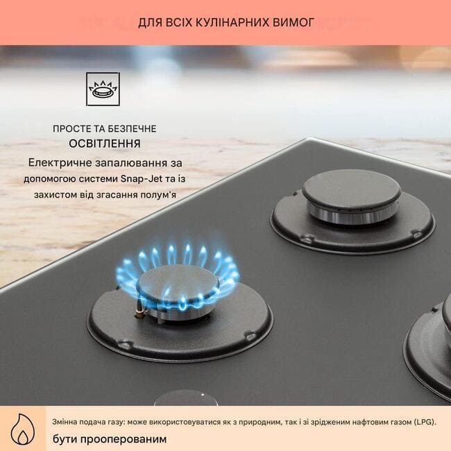 - потужна продуктивність завдяки конфорці вок потужністю 3,4 кВт, потужній конфорці потужністю 2,4 кВт, двом звичайним конфоркам потужністю 1,8 кВт і допоміжній конфорці потужністю 1 кВт