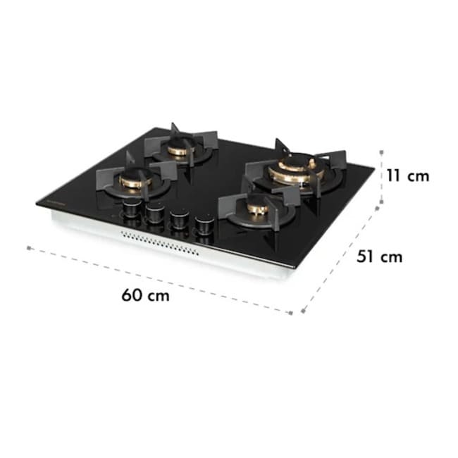 Газова варильна поверхня Klarstein Goldflame 4 пропонує максимальну гнучкість та ефективність завдяки чотирьом потужним латунним конфоркам на скляній поверхні. Спеціальне нанопокриття забезпечує легке очищення, а система захисту від полум'я та автоматичне запалювання забезпечують безпеку та зручність.