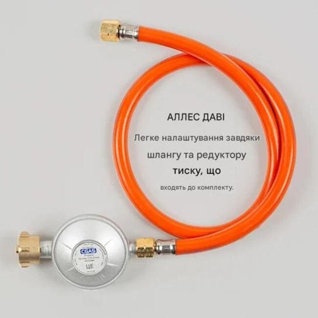 - Простота використання завдяки шлангу і редуктору тиску, що входить в комплект.