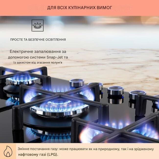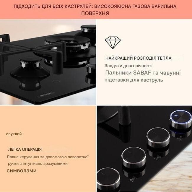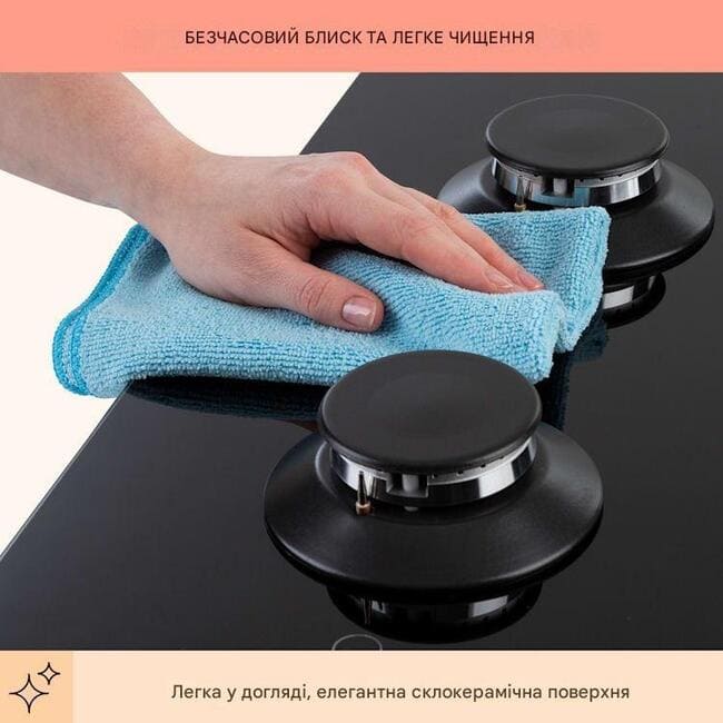 Після приготування можна використовувати газову плиту при необхідності можна легко очистити: для цього вона має поверхню із загартованого керамічного скла, що легко миється, товщиною 6 мм. Він не тільки виглядає неймовірно елегантно, але й надзвичайно простий у догляді.