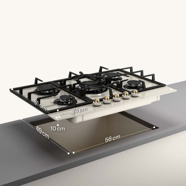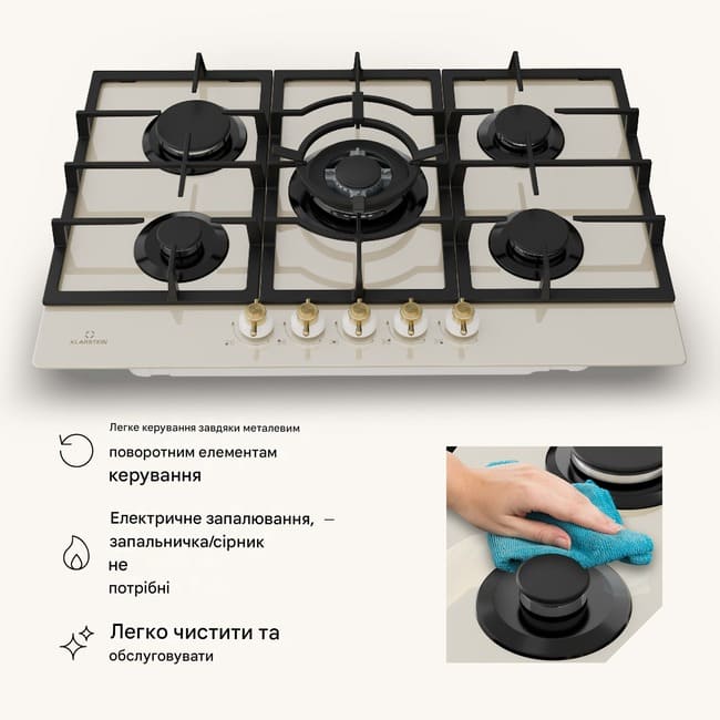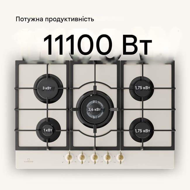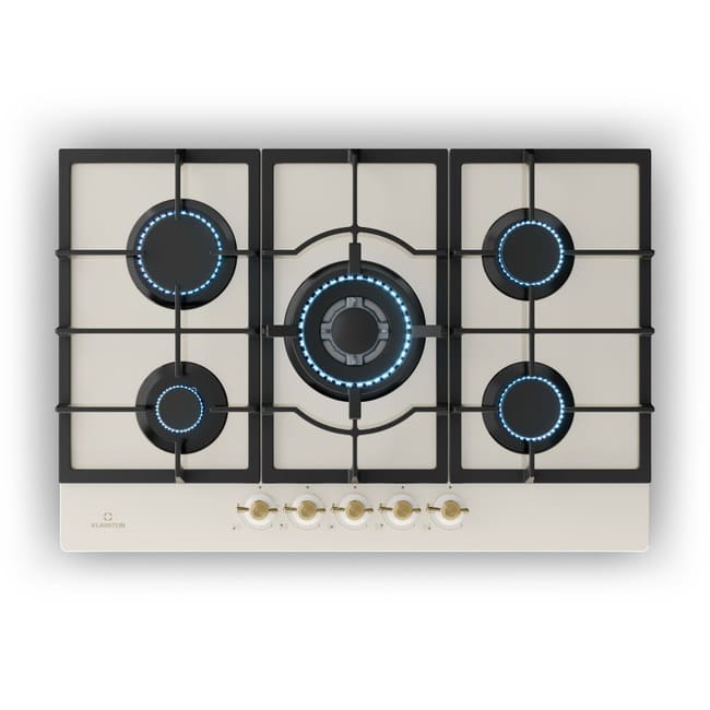 На просторій газовій плиті Klarstein Victoria 5 є п’ять високоякісних конфорок Sabaf , кожна потужністю 3,6 кВт, 3,0 кВт і 1 кВт, а також двічі по 1,75 кВт. Завдяки різним розмірам конфорок Victoria 5 підходить для будь-якої їжі, яку тільки можна собі уявити - конфорки рівномірно розподіляють тепло посередині та по краях посуду, тому все готується легко. Управління абсолютно інтуїтивно зрозумілим завдяки зрозумілим символам на великих кнопках ретро-дизайну; подачу тепла можна регулювати безпосередньо під час процесу приготування. Ви запалюєте полум'я за допомогою SnapJetIgnition , тому додатковий вогонь не потрібен. Три знімних хреста з міцного чавуну лягають на полум'я і не перекидаються. Варильна поверхня має загартоване, просте у догляді склокерамічне покриття, яке не лише гарно виглядає, але й особливо легко миється.