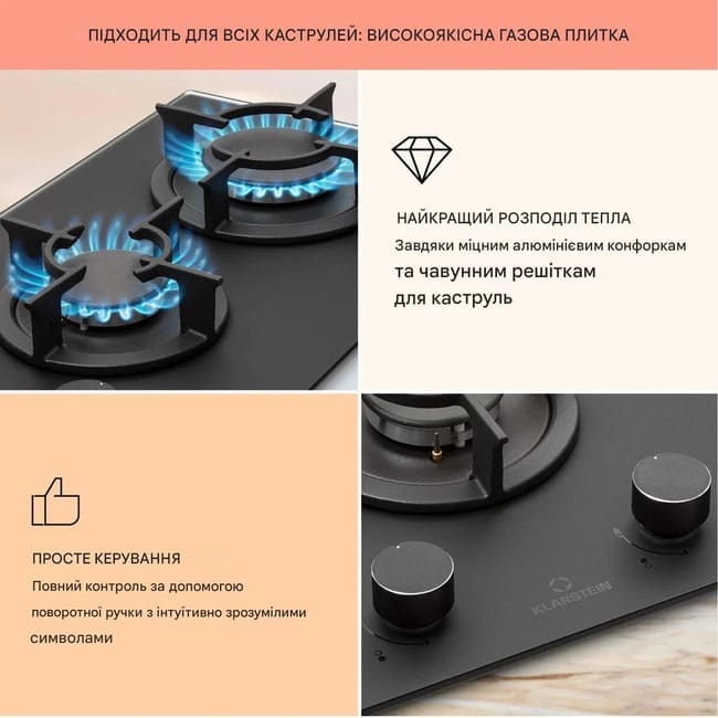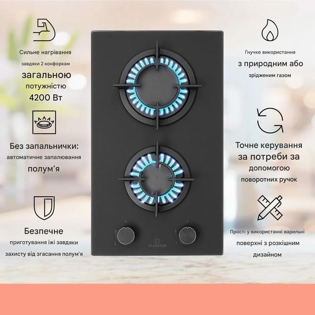 Компактна варильна поверхня Klarstein Firetale має дві алюмінієві конфорки, які належним чином нагріваються з потужністю 2,4 кВт та 1,8 кВт. Вони рівномірно розподіляють тепло в середині та по краях каструль або сковорідок, тому все готується просто, а подачу тепла можна регулювати в будь-який час за допомогою простих регуляторів. Хрестовина з міцного чавуну підходить практично для всіх типів посуду і точно сидить над полум'ям, не перекидаючись. Ви можете легко та безпечно розпалити вогонь без жодного сірника чи запальнички: газове полум’я просто запалюється за допомогою SnapJetIgnition , а захист від відключення полум’я перекриває подачу газу до пальника, якщо полум’я з будь-якої причини зникне.