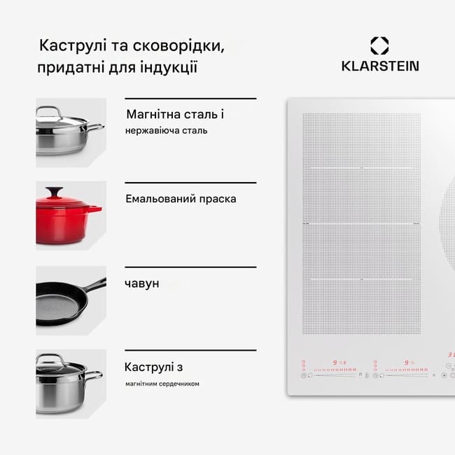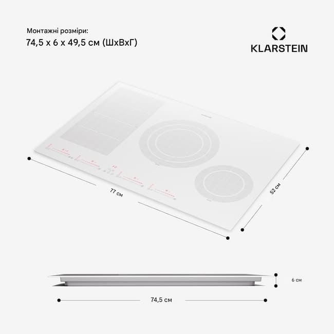 Елегантний дизайн зі склокерамічною поверхнею впишеться в будь-яку кухню не лише естетично, але й функціонально. Гнучка зона дозволяє використовувати більші каструлі та сковорідки. Інші практичні функції, такі як датчик каструлі, функція паузи та блокування від дітей, забезпечують додаткову зручність. Гібридна індукційна варильна поверхня Klarstein Masterzone 77 сумісна з різними матеріалами, але не підходить для алюмінію, міді, скла або термостійкого скла. Ідеальне поєднання інновацій, продуктивності та елегантності для вибагливих домашніх кухарів.