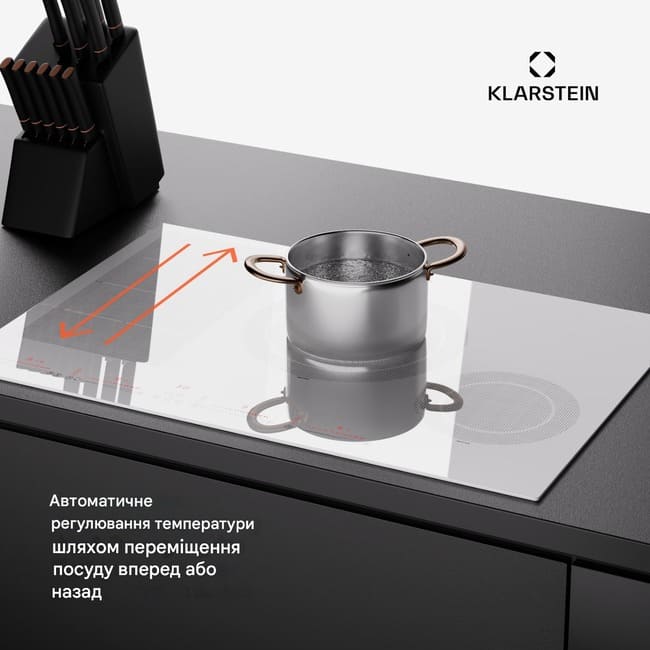 Гібридна індукційна варильна поверхня Klarstein Masterzone 77 революціонізує процес приготування їжі. Праворуч на варильній поверхні розташовані дві фіксовані зони приготування, а ліворуч — Flexzone, яка автоматично підлаштовується під розмір каструлі та оснащена технологією Smart Flex. Простим переміщенням каструлі вперед і назад автоматично регулюється температура. Цю революційну функцію можна активувати або деактивувати в будь-який час, натиснувши на символ на варильній поверхні.