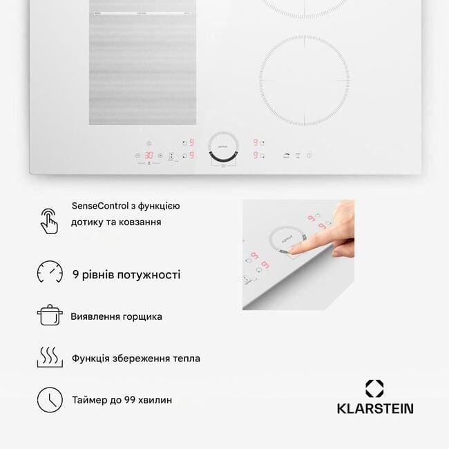 Просто більш гнучке приготування їжі: гібридна індукційна варильна поверхня Klarstein Delicatessa 70 дозволяє оптимально використовувати простір з мінімальним споживанням енергії. Вона поєднує технічні інновації з розкішним виглядом і надає кухні нового блиску завдяки своїй склокерамічній поверхні. Вбудована варильна поверхня також пропонує високий рівень безпеки: із захистом від перегріву, розпізнаванням посуду, індикатором залишкового тепла, автоматичним вимкненням та блокуванням від дітей. Технологія VarioHeating flex-zone дозволяє об'єднати дві варильні поверхні в одну зону приготування.