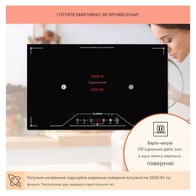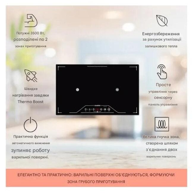 - Функція Boost: потужність 2200 Вт на одній половині конфорки для блискавичного нагріву