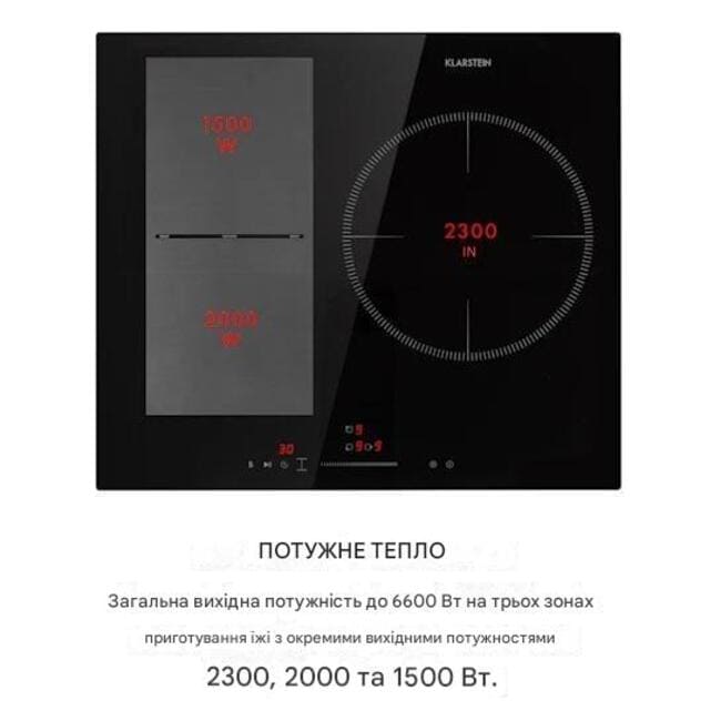 Вбудована варильна поверхня Klarstein Delicatessa 3 Flex пропонує три поверхні для приготування їжі загальною потужністю до 6600 Вт, розподіленою на 2300, 2000 та 1500 Вт між окремими поверхнями для приготування, доводячи вміст каструль та сковорідок до кипіння в години пік. VarioHeating об'єднує дві ліві зони приготування в одну гнучку зону: з максимальною гнучкістю вона адаптується до розміру каструль, сковорідок або запіканок, розміщених на ній, завдяки розпізнаванню каструль, таким чином нагріваючи навіть великий посуд, який не помістився б на одній конфорці. Для великих кулінарних проектів особливо практичною виявляється надзвичайно велика зона для паельї діаметром 28 см. Тут ви можете не тільки готувати страви у надзвичайно великих каструлях, але й достатньо місця для каструлі чилі для наступної домашньої вечірки або форми для консервування. Це означає, що Delicatessa 3 Flex використовує лише енергію, необхідну для каструлі, і може використовуватися практично з каструлями або сковорідками будь-якого розміру. Потужність усіх зон приготування можна регулювати окремо, а функція підсилення збільшує потужність до 3600 Вт для швидкого нагрівання. Склокерамічна варильна поверхня Klarstein Delicatessa 3 Flex легко керується за допомогою інтегрованої сенсорної панелі SenseControl з сенсорним керуванням потужністю та цифровим дисплеєм. Це означає, що ні кнопки, ні елементи керування не виходять за межі поверхні кухонного шафи. Окрім потужності, для кожної зони приготування можна запрограмувати таймер до 99 хвилин, який або вимикає конфорку після закінчення встановленого часу, або подає звуковий сигнал.